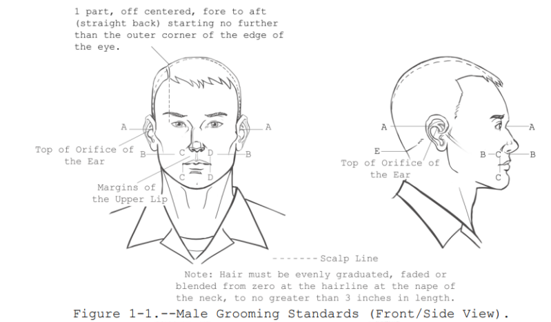 1. Sideburns will not extend below the top of the orifice of the ear, as indicated by the line A-A' in figures 1-1 and 1-2. Sideburns will not be styled to taper, flare or come to a point. The length of an individual hair of the sideburn will not exceed 1/8 inch when fully extended.